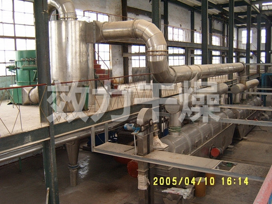物料自进料进口进入机内,在振动力作用下,物料沿水平面流化床抛掷,向前连续运动,热风向上穿过流化床同湿物料换热后,湿空气经旋风分离器除尘后由排风1:3排出.干燥物料由排料进口排出。