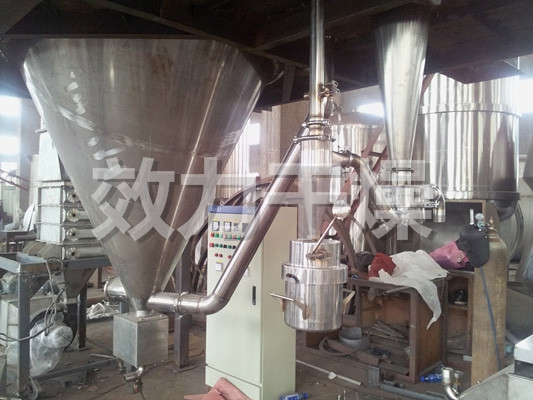 该机采用全封闭形式,所有部件均采用不锈钢制造,配有三级净化装置,过滤后的空气达十万级要求。筒体与顶部装有冷壁装置,使壁温<80℃,干燥塔内装有气刷扫塔装置。经该机干燥后的中药浸膏粉,不会出现焦化变质现象,大大增加了收粉率(95%以上),而且不会产生混药现象和粘壁现象。