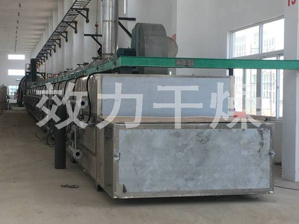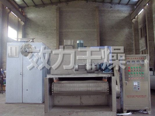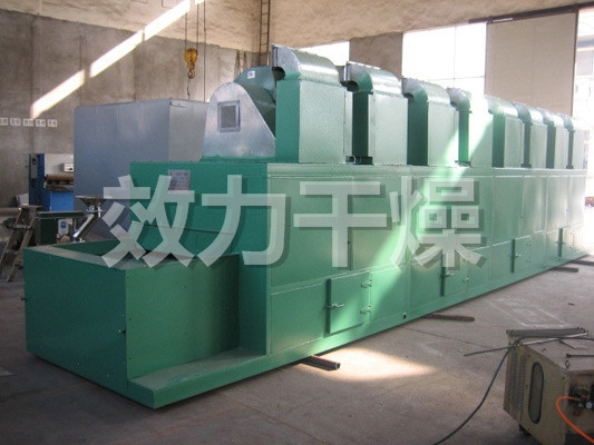 物料由加料器均匀地铺在网带上,网带一般采用12-60目不锈钢丝网,由传动装置拖动在干燥机内移动。干燥机由若干单元组成,每一单元热风独立循环,部分尾气由专门排湿风机排出,废气由调节阀控制,热气由下往上或由上往下穿过铺满物料的网带完成热量与质量传递的进程,带走物料水份。网带缓慢移动,运行速度可根据物料温度自由调节,干燥后的成品连续落入收料器中。上下循环单元根据用户需要可灵活配备,单元数量亦可根据需要选取。